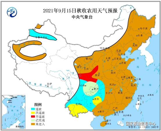 西南、西北地區(qū)秋收陸續(xù)展開。中央氣象臺9月14日發(fā)布的秋收秋種氣象服務稱,預計未來三天(15-17日),甘肅隴東和隴南、四川盆地等地有小到中雨,局地大到暴雨,對...