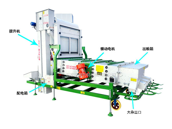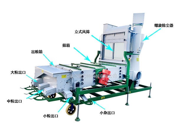 5XFS系列風篩清選機由超低速無破碎提升機、環(huán)保除塵器、密閉回轉(zhuǎn)卸灰閥、立式空氣篩、振動分級篩五部分組成。物料經(jīng)提升機進入散糧箱,被均勻分散進入立式風篩,物料在風力的作用下分離出輕雜質(zhì),輕雜質(zhì)經(jīng)旋風除塵器過濾后由回轉(zhuǎn)卸灰閥排出,其余物料進入篩箱,根據(jù)物料的外形尺寸來調(diào)整不同規(guī)格的精密沖孔篩片,去除大雜和小雜,同時通過增減篩片的層數(shù)將成品分成大粒、中粒、小粒。