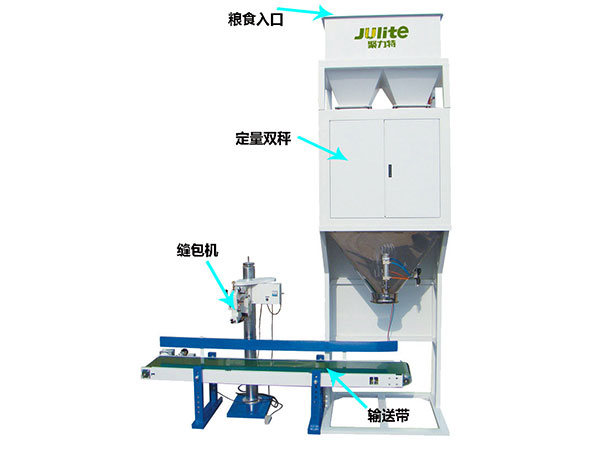 設(shè)定包裝范圍后,物料由給料機(jī)構(gòu)加入稱量斗,控制器收到傳感器的重量信號后,按預(yù)先設(shè)定的程序值進(jìn)行控制,開啟加料門進(jìn)行給料;當(dāng)達(dá)到設(shè)定的范圍,給料機(jī)構(gòu)停止給料,開始另一個(gè)秤體的給料。自動(dòng)振袋后,觸動(dòng)行程開關(guān),物料袋自動(dòng)松開落入輸送帶上,被送到縫包機(jī)完成縫包。